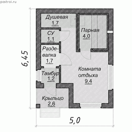 Проект бани, габаритами - 5 на 6,5 м, общей площадью 22 кв.м, с наружными стенами из пеноблоков, фундамент – монолитный. В проекте бани предусмотрено небольшое крыльцо, тамбур, комната отдыха хорошей площади позволяет отдыхать компанией, после посещения парной
