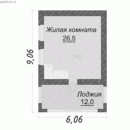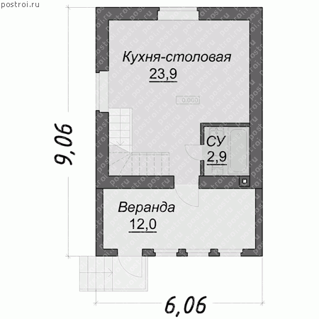 Компактный, прямоугольный дом, габаритами 9,06 на 6,06 м и общей площадью 65 кв.м. Основанием дачного дома служит сборный ж/б фундамент, стены выполнены из газосиликатного блока с утеплителем и наружной отделкой из облицовочного кирпича. Проект дома, позволяет уютно разместится в дачный сезон, располагая просторной кухней-столовой, верандой, небольшим санузлом с ванной. На втором этаже имеется большая жилая комната с лоджией. Представленные, архитектурно-строительные чертежи дачного дома, содержат всю необходимую информацию для возведения надежного жилья
