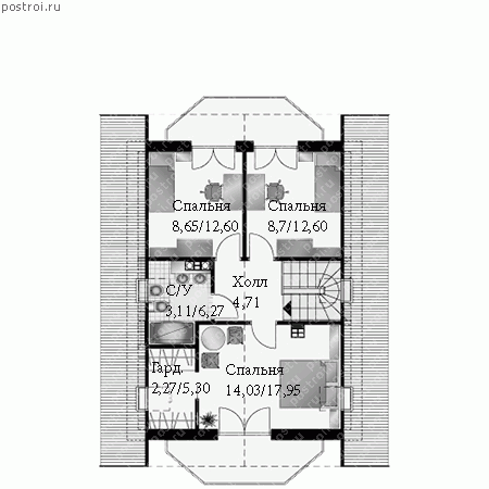 Проект загородного коттеджа с эркером и балконом предназначен для индивидуальной застройки. Здание с привлекательными фасадами прекрасно подойдет для постоянного проживания 3-4 человек. Три уютные спальни, одна из которых с персональной гардеробной, выходят на балконы. Первый этаж отведен под помещения зоны дневного пребывания семьи. Здесь находится гостиная, где можно установить камин, кухня с небольшой кладовой, столовая с остекленным эркером, санузел, доступ в который организован из тамбура. Наружные стены коттеджа однослойные – из блоков толщиной 365 мм, оштукатуренные цементно-известковой штукатуркой. Простая двускатная кровля экономична в строительстве. Проект коттеджа с эркером и балконами разработан также и в зеркальном варианте.