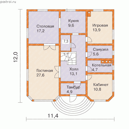 Типовой проект коттеджа из клееного бруса, выполненный в классическом стиле. Дом достаточно компактный в плане, при этом просторный внутри, второй этаж полноценный, есть чердачное помещение. На первом этаже, в одном крыле дома размещена гостиная зона, совмещенная со столовой, кухня окнами выходит на задний двор. Стены из клееного бруса. В другом крыле расположен кабинет главы семейства и игровая комната – из этих помещений можно сделать спальные комнаты. На втором этаже размещены четыре спальни, одна из которых имеет свой сан.узел. В просторном и светлом холле можно сделать бильярдную или тренажерный зал. Коттедж из клееного бруса подходит для постоянного всесезонного проживания за городом. Аналогичные варианты домов из клееного бруса.
