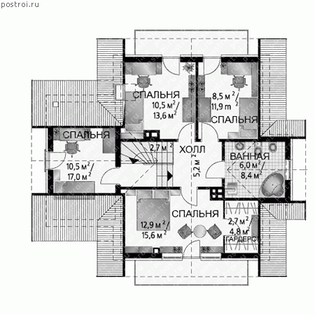 Одноэтажный дом, представлен общей площадью 243,98 кв.м и габаритами 10 на 12 м. Небольшой компактный дом, фасады которого декорированы красивыми балконами и приближены к европейскому стилю, предусматривает просторную террасу на заднем дворе. В проекте, кроме архитектурных достоинств, также полный набор всех помещений для постоянного и комфортного проживания семьи из 4-5 человек. Первый этаж, располагает тамбур, санузел с душевой кабиной, кухню-столовую, большую гостиную с камином и возможным выходом на террасу. В загородном доме 10 на 12 м, предусмотрен гараж для одного автомобиля. Зона отдыха и сна хозяев, запроектирована на мансардном этаже в виде: четырех спален, большой ванной комнаты, объединенной с санузлом, также из каждой спальни, возможен выход на балкон. Для фанатов деревянных домов 10 на 12 м, данный проект представляет такой вариант, а также вариант из ячеистого бетона
