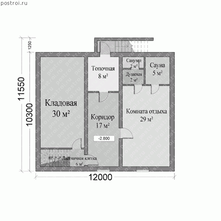 Преимущество загородного дома из керамоблоков в том, что сооружается он в три раза быстрее, чем из обыкновенного кирпича. Кровля дома выполнена из мягкой черепицы, основанием дома служит монолитный фундамент. Цокольный этаж, включает в себя большую кладовую, сауну с душевой и санузлом, комнату отдыха, топочную. Интересно решение представляет правая часть дома, где стена выполнена в виде двух эркеров, в этой части дома запланирована просторная кухня-столовая с гостиной. Встроенный гараж, предназначен для одного автомобиля. Загородный дом, на втором этаже располагает четырьмя комнатами отдыха и одной ванной комнаты. Компактный дом, с жилой площадью 119 кв.м и габаритами 11,55 на 12,0 м, предназначен для семьи из 4-5 человек. Дом входит в раздел до 400 кв.м