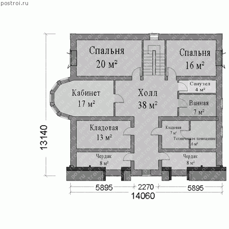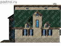 Проект двухэтажного дома с цоколем, имеет интересное решение по устройству кровли. Общая площадь составляет 395 кв.м, габариты 14,29 на 14,06 м, подходит для семьи из 4 человек. Компактный дом, представляет все условия для постоянного проживания в нем. Наружные стены выполнены из газосиликатных блоков, а отделка в виде облицовочного кирпича, кровля покрыта мягкой черепицей. Большая тренажёрная позволяющая заниматься спортом дома, котельная и мастерская, являющееся неотъемлемой частью для скульптора, художника и т.д. Гостиная отдельно от кухни-столовой, две спальни, большая ванная комната отдельно от санузла, предусмотрено место для вестибюля и небольшой гардеробной. На втором этаже располагается две спальни, ванная комната, санузел, большая кладовая, техническое помещение, два чердака. Запроектированный круглый эркер на втором этаже, позволяет увеличить внутреннее пространство кабинета, а также улучшить освещенность и инсоляцию. Данный проект входит в категорию «Проекты пенобетонных домов»