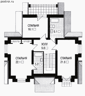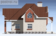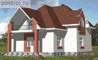 Небольшой двухэтажный коттедж с хорошо продуманной архитектурой главного фасада. Выступающие эркеры не только придают дому торжественный вид, но и позволяют найти интересные интерьерные решения помещений второго этажа. Планировка дома проста и рациональна. Первый этаж делится на два объема. В отдельную зону вынесены технические помещения и гараж, в другой части расположены гостиная и кухня. Второй этаж традиционно отведен под спальные комнаты. Здание не имеет подвала, что позволяет разместить его на «мокрых» грунтах.