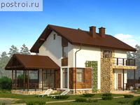 Двухэтажный загородный дом, представлен с террасой и балконом. Архитектура дома, подчёркивается комбинированной отделкой, которая выполняется штукатуркой, камнем и вагонкой. В проекте на главном входе предусмотрено крыльцо с возможным входом в котельную. Планировка первого этажа, располагает кладовую для консервации и бытовых приборов, санузел, кухню, совмещенную с гостиной. В гостиной комнате, обустроен камин и возможный выход на террасу. Небольшая по площади терраса, позволяет устраивает семейные обеды на свежем воздухе. На втором этаже, запроектировано три спальни, ванная комната, совмещенная с санузлом и общий балкон. Планировка двухэтажного дома, позволяет комфортно разместится семье из 3-4 человек
