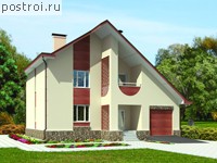 Двухэтажный загородный дом с гаражом, лаконичный по архитектурному решению и прост по планировочному решению. На первом этаже запроектирован просторный вестибюль с выходом в гостиную, ванную комнату и в большую кухню-столовую. Дополнительным украшением интерьера кухни-столовой служит деревянная лестница на второй этаж. На втором этаже располагаются три спальни, с выходом из одной на лоджию.
