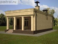 Хамам с комнатой отдыха, запроектирован общей площадью 79,5 кв.м с габаритами 12,49 на 6,77 м. Данный проект представлен с верандой, в которой обустроено барбекю. Большой плюс, что предусмотрен тамбур, который защищает от холодного воздуха и неприятных запахов. Также в проекте хамама, запроектирована просторная комната отдыха, санузел, душевая и генераторная с отдельным входом с улицы. Строительство, осуществляется на монолитной ж/б плите, кирпичные стены с утеплителем, для плоской кровли применяется рулонное покрытие. Хамам, считается отличной пристройкой к загородному дому, выполненному в классическом стиле
