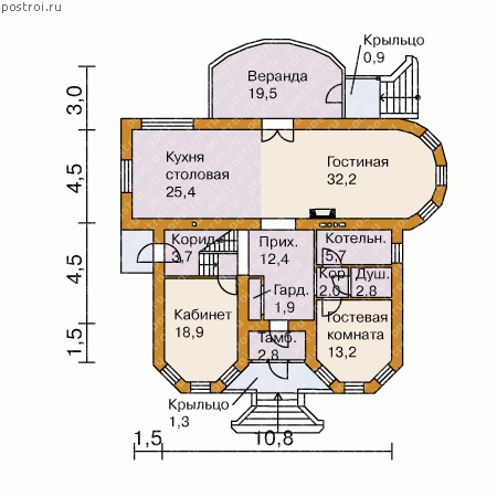 Готовый проект дома из газобетона подойдет для семьи из шести – семи человек. Большой уютный дом можно использовать как для сезонного, так и для постоянного проживания. На первом этаже типового проекта кирпичного дома есть все необходимые технические и жилые помещения, такие как кухня-столовая, соединенная с гостиной в студию, отдельный санузел котельная и веранда. Так же первый этаж включает в себя гостевую комнату и кабинет, который при желании так же оборудуется под жилую комнату. Второй этаж включает в себя четыре уютные спальни, одна из которых имеет выход на балкон, а так же отдельный санузел. Необычность этому дому придает большое количество эркеров за счет которых фасады дома приобретают нестандартные, благородные очертания.