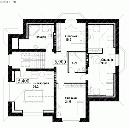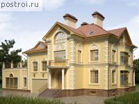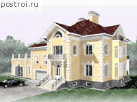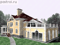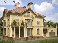 Прекрасно выполненная отделка фасадов и большое количество балконов и террас делают проект красивого кирпичного дома очень респектабельным. А продуманная внутренняя планировка и наличие всех необходимых жилых технических помещений располагают к комфортному проживанию в нем. В цокольный, технический, этаж кроме всего вынесена сауна с примыкающей комнатой отдыха и тренажерная комната. Правую часть первого этажа занимает единое пространство гостиной и столовой, удобно сообщающееся с кухней. Гараж имеет вход напрямую в дом. Большой бассейн расположен справа в светлом за счет панорамного остекления помещении. На втором этаже дома из кирпича расположены четыре уютные спальные комнаты, каждая из которых по-своему комфортна. Также на втором этаже находится зимний сад с выходом на просторную террасу. В мансардном этаже расположены еще три спальни и бильярдная комната.
