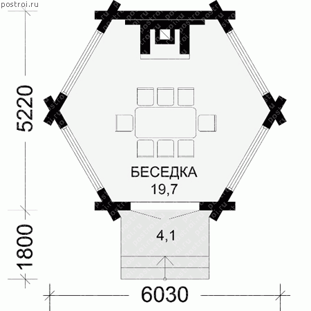 Зачем нужны чертежи беседки? Каждый рачительный хозяин, желающий обустроить ухоженную территорию вокруг дома, рано или поздно задумывается о строительстве беседки. Месте, где можно укрыться от внезапного дождя, найти тень в жаркий день, где так приятно отдыхать с родными и друзьями. Беседка с барбекю впишется в окружающий ландшафт участка, придаст ему завершенный облик. Типовые чертежи – готовое решение для скорейшего начала работ. Согласно чертежам, в основании ленточный монолитный фундамент. Стены выполняются из оцилиндрованного бревна. Габариты постройки 6.03 на 7.02 м.