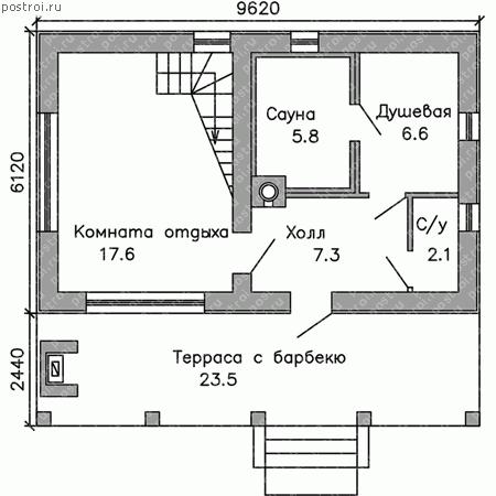 Проект бани с террасой-барбекю, габаритами 8,56 на 9,62 м, представлен из газобетона 400 мм, с мансардной кровлей покрытой композитной черепицей. Первый этаж запроектирован под сауну, душевую, санузел и большую комнату отдыха для посиделок с друзьями. Также друзей можно порадовать не только хорошей парилкой, но и вкусными блюдами из мяса, приготовленные на террасе-барбекю располагающейся на всю ширину дома у входа. Мансарда с двумя спальнями предназначена для отдыха после хороших посиделок. В плане бани с комнатой отдыха, созданы все условия для комфорта