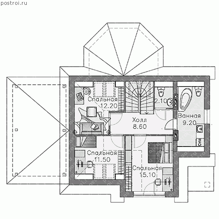 Проект дома с навесом для машины запроектирован из газобетона. Дом небольшой, но вместительный. Два этажа вмещают в себя гостиную с камином, кухню-столовую, котельную, два санузла, ванную комнату и три спальни. Естественное освещение мансардного этажа обеспечивается, главным образом, окнами верхнего света, за исключением шестиугольного окна главного фасада. К тому же, к дому пристроена открытая веранда для отдыха на свежем воздухе и экономичный вариант гаража - навес.