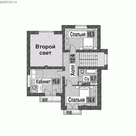 Если вам близок романтический облик домов в стиле «Шале», альпийский образ которых создает атмосферу надежного, уютного, теплого жилья, рассмотрите данный проект коттеджа со вторым светом. Наружные стены возводятся из поризованного кирпича, отделка производится штукатуркой, деревом и камнем. Такие характерные элементы как балконы и терраса, специфический вынос скатов пологой кровли, защищающий от непогоды, наличие в двусветной гостиной камина – все это рождает суровую, но вместе с тем гармоничную, созвучную окружающей природе индивидуальную красоту и особый шарм этого загородного дома. Двусветный интерьер просторной гостиной открывает безграничные возможности для оригинальных решений в оформлении свободного пространства, чего так не хватает обитателям городских квартир. Типовым проектом коттеджа со вторым светом предусмотрен гараж-навес для машины.