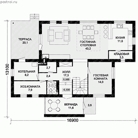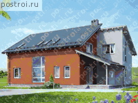 Проект двухэтажного дома, общей площадью 229,9 кв.м и габаритами 13,0 на 16,9 м имеет интересное архитектурное решение в виде разделения дома на две половины. Разделение выполнено за счет односкатной кровли и наружной отделки в виде окраски со штукатуркой в два разных цвета. Основанием для проекта служит монолитная ж/б плита, стены запроектированы из газобетона, для покрытия кровли, используется металлическая черепица. Высота первого этажа 2,93 м, который располагает веранду, хоз. комнату, котельную с выходом на террасу, гостиную-столовую объединенную с кухней, кладовую и гостевую спальню. Также на втором этаже предусмотрена галерея со втором светом, который делает акцент на зоне гостиной-столовой. Второй этаж, запроектирован с четырьмя спальнями, двумя ванными комнатами совмещенными с санузлом. Двухэтажный дом, разработан в зеркальном варианте
