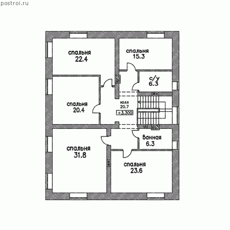 Проект загородного дома, общей площадью 300 кв.м и габаритами 15,94 на 12,76 м без учета крыльца. Классический стиль внешнего оформления фасада, является очень привлекательным и подходит для людей, любящих сдержанность, простоту и строгость форм. Кирпичный дом состоит из двух полноценных этажей с высотой 3,05 м. Наружные стены выполнены из крупноформатного поризованного кирпича, перекрытие – монолитное, покрытие кровли производится металлочерепицей, отделка цоколя - искусственным камнем. В плане на первом этаже, запроектировано прихожая с достаточным местом для устройства небольшого шкафа для верхней одежды и пары стульев, кухня-столовая располагается отдельно от просторной гостиной, санузел объединённый с ванной, гостевая спальня, комната для котла. Плюс задействовано место под лестницей для устройства кладовой, где можно хранить все хоз. принадлежности. Второй этаж загородного дома, предполагает устройство четырех спален, и двух ванных комнат с санузлом
