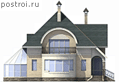 Двухэтажный коттедж с современной выразительной архитектурой, украшенный полукруглым зимним садом. Архитектура дома, интересная своим объемным и пластическим решением, создает яркий и выразительный образ. Проектом предусмотрены два этажа. Первый этаж — традиционное для загородного дома пространство для общения. Здесь оно решено комфортно и изящно. Гостиная, кухня и столовая объединены в одно помещение, при этом столовой отведен полукруглый остекленный эркер, куда отлично впишется обеденный стол. Смежено с ней расположена кухня, а от гостиной она визуально отделена угловым камином. По центру гостиной находятся двустворчатые остекленные двери в зимний сад. По лестнице можно спуститься к уровню земли, где у заднего фасада расположена площадка для барбекю с уличным камином. На втором этаже расположены три спальни, ванная комната и небольшой санузел. Две смежные спальни имеют общий балкон, в ванной комнате нашлось место для небольшой сауны — очень удобная, комфортная планировка.