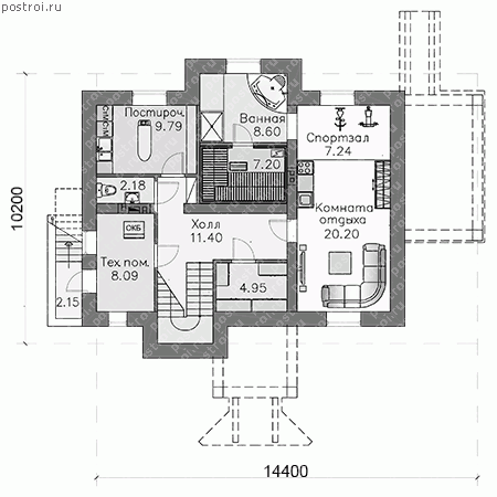 Большой двухэтажный дом с цоколем, представлен общей площадью 259,74 кв.м и габаритами 10,2 на 14,4 м. Простота и логичность планировочного решения, позволяет разместить семье из 3-4 человек. В загородном доме сауна с большой душевой и комнатой отдыха, спортзал, кладовая, котельная и санузел представлены на цокольном этаже. В проекте на первом этаже, представлена прихожая, гостиная-столовая с камином и выходом в зимний сад, кухня, ванная комната, совмещенная с санузлом и кабинет, позволяющий работать дома. Второй этаж, располагает три спальни для отдыха хозяев, ванную комнату, просторный холл, предусматривает выход на балкон. Большой плюс планировки, за то, что предусмотрен второй свет с акцентом на гостиную, который привлекает свой взгляд и подчеркивает общий интерьер дома с цоколем. Также данный проект, разработан в варианте без цоколя с мансардой и в зеркальном варианте