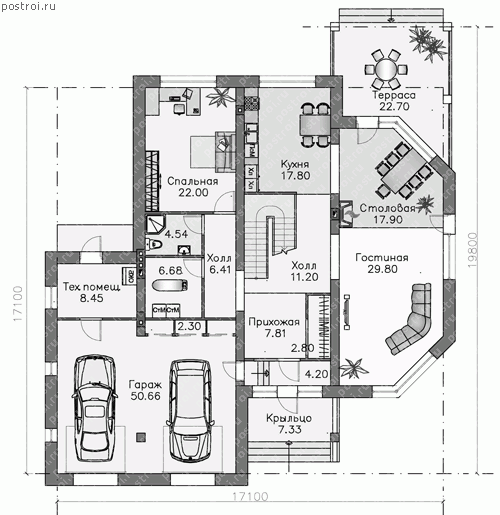 Проект дома с гаражом на две машины отличается комфортной и оригинальной планировкой, изюминкой которой является двусветная столовая-гостиная своеобразной пятигранной конфигурации. Большая площадь остекления соответствует современным тенденциям загородной архитектуры. В доме предусмотрены два полноценных жилых этажа. Помимо гостиной, первый этаж включается в себя кухню, спальню, санузел и техническое помещение. Открытая терраса может использоваться для семейных трапез на свежем воздухе в теплое время года. В гараж можно попасть непосредственно из дома. На втором этаже находятся три спальни, одна из которых выходит на лоджию, две ванные комнаты и гардеробная.