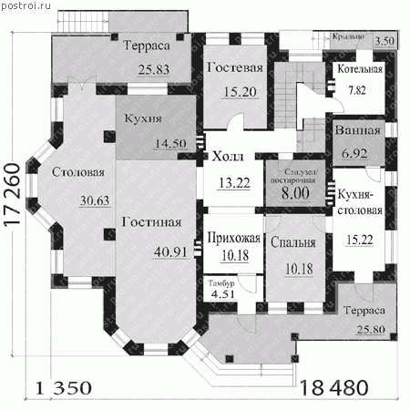 Проект коттеджа для большой семьи из 6 человек, представлен общей площадью 372,23 кв.м и габаритами 17,26 на 18,48 м. Красивый двухэтажный дом, возводится из поризованного кирпича, с наружной отделкой стены лицевым кирпичом, кровельным покрытием служит металлическая кровля. Планировка первого этажа, включает две террасы, тамбур, прихожую, кухню-столовую, гостиную, постирочную, котельную, гостевую спальню. Для обслуживающего персонала выделяется одна спальня с личной кухней и ванной комнатой. На втором этаже, находятся четыре спальни, детская игровая, несколько гардеробных, ванная комната, санузел и большая терраса.Коттедж включает все условия для постоянного проживания большой семьи