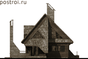 Трехкомнатный деревянный дом-коттедж с подвалом. Маленький дачный дом запроектирован в стиле закарпатских сельских домов. Запоминающийся образ здания формирует сложное многоскатное решение кровли. Дом предназначен для сезонного пребывания в теплое время года. Может использоваться как гостевой дом на участке с основным домом. Деревянный дом запроектирован в двух этажах, второй этаж - мансардный. На первом этаже размещены тамбур, холл-прихожая, санузел, кухонная зона, столовая и гостиная. На кухне может быть выложена отопительно-варочная печь. На втором этаже устроены две спальни и большой холл-библиотека. Под частью дома устроен подвал, с входом в него по лестнице-стремянке из кухни. Интерьерным акцентом планировки первого этажа является лестница со вторым светом. Такое решение визуально увеличивает пространство первого этажа.При неблагоприятных инженерно-геологических условиях участка застройки подвал под домом может не делаться.