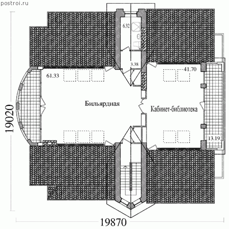 Основание для дома, запроектировано монолитной плитой по бетонной подготовке в сочетании с ленточным монолитным фундаментом под часть здания. Наружные стены представлены в двух вариантах: - из газобетона; - из кирпича. Габариты дома составляют 19,02 на 19,87 м. Дом располагает небольшой тренажерной, сауной, бассейном для которого оборудована отдельно хлораторная, комната отдыха, подсобное помещение и комната для установки котла. На втором этаже находится четыре спальни, кладовые, два санузла с ванной. Эркер круглой формы, увеличивает внутреннее пространство гостиной, в которой возможна установка камина, часть холла отделяется от гостиной балюстрадой. Одно из любимых мест для хозяев, будет являться мансарда, где для активного отдыха располагается большая бильярдная, а для уединения и размышления кабинет-библиотека. Также на мансарде есть два балкона, кладовая, санузел. Дом с такой планировкой, подходит для семьи из 5 человек и входит в категорию до 500 кв.м