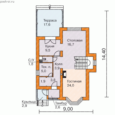 Дом 9 на 14 подойдет для узкого участка. Два этажа включают в себя три уютные спальни, кухню, два санузла. Гостиная и столовая находятся по обе стороны от лестницы, расположенной в эркере. В гостиной запроектирован камин. В дом можно попасть как с крыльца главного фасада, так и с террасы заднего (дворового) фасада. Цветовая гамма наружной отделки из кирпича и штукатурки в сочетании с кровлей, покрытой фактурной черепицей, придают облику дома особую привлекательность. Дом предназначен для постоянного или сезонного проживания семьи из 3-4 человек.