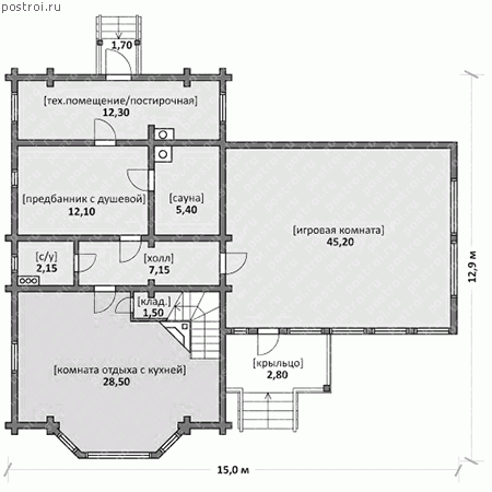 Деревянный дом из бруса 200 мм, запроектирован общей площадью 164,9 кв.м с габаритами 12,9 на 15,0 м. Второй этаж, выполнен в виде мансардного. Планировка проекта, позволяет разместить семью из 3 человек. Данный деревянный дом, считается домом отдыха, позволяющий приезжать с семьей или компанией друзей и весело проводить время. Возводится на монолитной ж/б плите, стены из клееного бруса 200 мм с отделкой тонировкой, мансардная кровля, покрывается цементно-песчаной черепицей. Высота первого этажа 2.6 м, а мансардного от 1.4 до 2.87 м. Планировка первого этажа, располагает большую игровую комнату, комнату отдыха совмещенную с кухней, санузел, сауну, предбанник с душевой и техническое помещение с обустроенным выходом на задний двор. На мансардном этаже дома из бруса, запроектировано две спальни, санузел с душевой кабиной и небольшая гардеробная