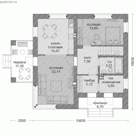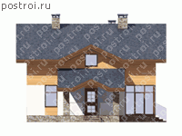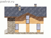 Для постоянного проживания одной семьи – красивый загородный дом с панорамными окнами. Проектом предполагается возведение наружных стен из газобетонных блоков с отделкой штукатуркой, планкеном и искусственным камнем. Угловое остекление предусмотрено в гостиной, там же запроектирован камин. Вход в дом осуществляется с крыльца: в тамбур и отдельный – в техническое помещение, отведенное под размещение отопительного котла. Презентационная зона также имеет выход - на крытую террасу. Для пожилых родственников или гостей предназначена спальня на 1-ом этаже. Три жилые комнаты расположены в мансардном уровне здания. Доступ на общий балкон организован из холла. Внешний вид строения формируют квадратный план и двускатная кровля дома с панорамными окнами, по проекту его размеры 10.63 на 10.63.