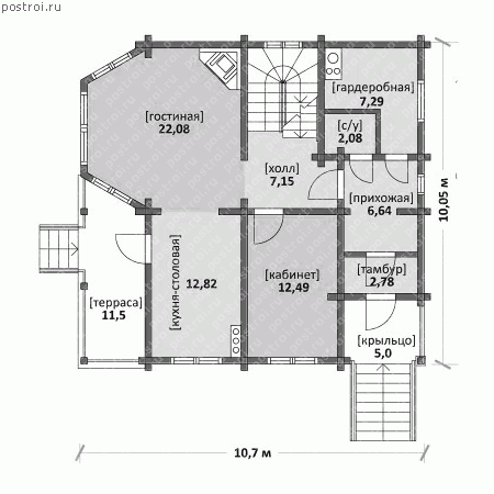 Если вы находитесь в поисках проекта красивого дома из бруса с цокольным этажом – стоит рассмотреть данный загородный коттедж. Здание подходит для участков с перепадом высот. В основании дома лежит монолитная ж/б плита. Материал возведения наружных стен – клееный профилированный брус 200 мм с отделкой – тонировкой. Этот загородный дом привлекателен внешне – акцент на живописном эркере двухсветной гостиной с панорамными окнами, гармонично впишется в любой ландшафт. Планировочное решение позволяет разместить на трех этажах здания множество функциональных помещений. Цокольный этаж – техническая и вспомогательная зона дома. Здесь находятся котельная с отдельным выходом, постирочная и просторный гараж. Первый этаж – презентационная зона дома. Двухсветная гостиная с угловым камином объединена с кухней-столовой. Отсюда имеется выход на террасу, предназначенную для семейного досуга в теплое время года. Обилие света обеспечивается наличием панорамных окон эркера. В распоряжении хозяев дома на первом этаже предусмотрена жилая комната. Ее можно использовать как кабинет, гостевую или спальню для пожилого члена семьи. Рационально оформлена входная группа, включающая в себя: крыльцо, тамбур, прихожую и гардеробную. Здесь же размещается санузел. В холле расположена междуэтажная лестница с поворотными ступенями. Второй этаж – приватная зона отдыха. Две смежные спальни выходят на общий балкон. Из холла можно попасть в ванную комнату. Живописный вид на гостиную также доступен из холла.