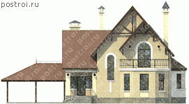 Дом с жилой мансардой запроектирован из кирпича , но также может быть выполнен из газобетона. Привлекательный внешний облик дополняется рациональной планировкой, которая отвечает современным требованиям комфортного проживания. Пространство первого этажа занимает зона отдыха, представленная просторными гостиной и кухней-столовой с выходом на крытую террасу, кроме того, их прихожей можно попасть в хозяйственные помещения – гардероб, санузел, тех.помещение. На втором этаже находятся сауна и три не смежные спальни, отделенные друг от друга помещениями холла и санузла. Одна из спален имеет выход на живописный балкон. Помимо этого, в доме запроектирован мансардный этаж, в котором находятся две дополнительные спальни достаточно большой площади. К дому пристраивается внешний гараж-навес для двух автомобилей.