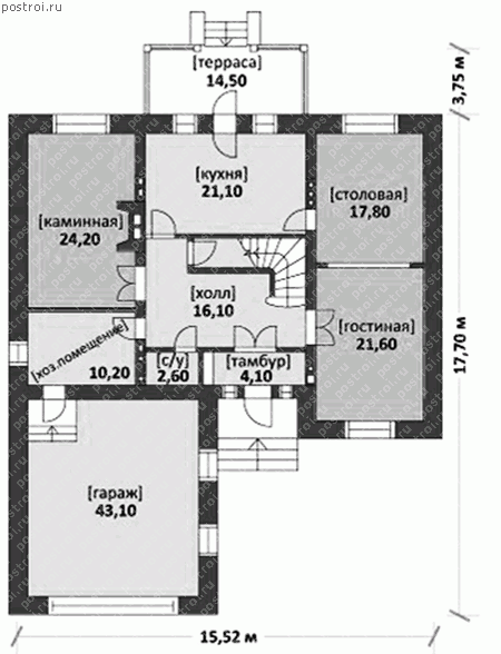 Проект кирпичного дома с цокольным этажом и гаражом, представлен общей площадью 397,4 кв.м с габаритами 21,45 на 15,52 м. Великолепный дом, рассчитан на постоянное проживание семьи из 3-4 человек. Планировка цоколя, располагает все подсобные помещения, также предусмотрено место для устройства сауны. Вход в дом, обустроен тамбуром. На первом этаже, запроектирована гостиная, столовая, кладовая, каминная, кухня с выходом на террасу. Зона отдыха хозяев, представлена на втором этаже в виде трех спален, двух гардеробных, ванной комнаты и санузла с душевой кабиной. Возводится кирпичный дом на ленточном сборном фундаменте, наружная отделка стен выполняется облицовочным кирпичом, кровельным покрытием служит цементно-песчаная черепица