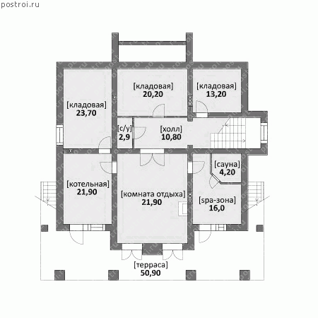 Красивый дом, отличной подойдет для участка со склоном, его общая площадь 496,56 кв.м с габаритами 18,75 на 16,64 м. Стиль проекта очень близкий к шале, поскольку наружная отделка стен выполняется лицевым кирпичом, натуральным камнем и планками из лиственницы. Основанием для красивого дома, служит монолитная ж/б плита, стены из поризованного камня, для покрытия кровли используется цементно-песчаная черепица. В проекте предусмотрен цокольным этаж, высотой 2.94 м, на котором располагается несколько кладовых, котельная, сауна с комнатой отдыха и санузел. Первый этаж, запроектирован с прихожей, постирочной, кладовой, санузлом с душевой кабиной, кухней-столовой, гостиной с камином и возможным выходом на террасу. Для работы на дому предусмотрен кабинет, также для людей в возрасте на первом этаже представлена спальня с личной ванной комнатой. Мансардный этаж высотой от 1.86 до 3.98 м, служит местом для отдыха хозяев, в виде двух спальных комнат, большой ванной комнаты, совмещенной с санузлом, гардеробной. Большой плюс планировки, в том, что обустроен второй свет с акцентом на помещение гостиной. Проект разработан для проживания семьи из 3-4 человек