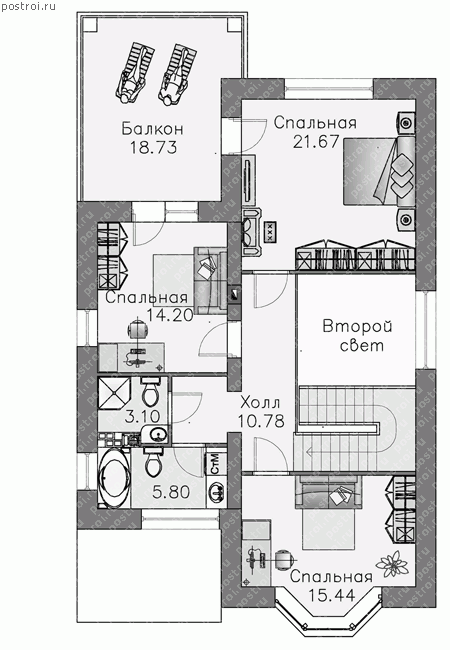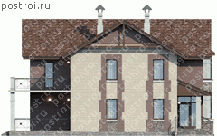 Проект дома с балконом и террасой – модификация проекта дома с гаражом-навесом. Все достоинства, привлекательность планировки и внешнего облика своего собрата представлены здесь в том же объеме, за исключением гаража. Данный проект прекрасно подойдет для людей, желающих строить отдельно стоящий гараж либо вовсе не нуждающихся в нем.