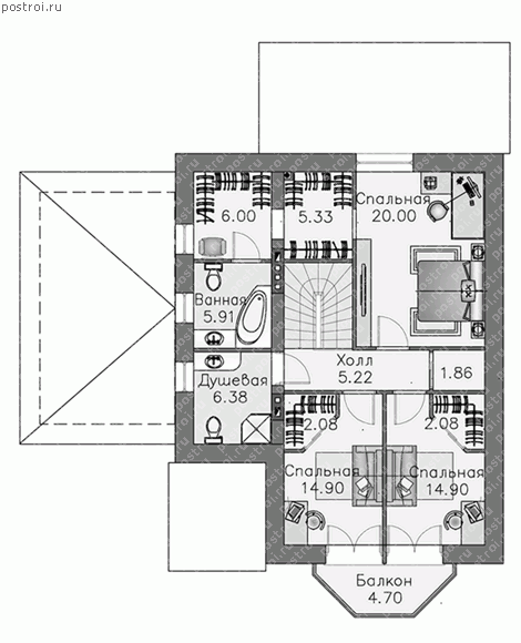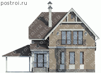 Дом для семьи с двумя детьми вполне отвечает понятию «семейное гнездо». Дом может быть возведен из кирпича, а предлагаемая альтернатива ему ˗ газобетон. Весь облик дома ˗ его геометрия, цветовая гамма отделки в бежевых тонах, создают атмосферу стабильности, основательности, уюта. Значительную площадь первого этажа занимает гостиная˗столовая с эркером и камином, логически продолжаемая кухней. Они составляют единое пространство, но могут быть разделены благодаря множеству вариантов дизайна интерьера. Кухня имеет выход на открытую террасу, что очень удобно для использования ее в летнее время для трапезы на открытом воздухе. На первом этаже также находятся тех.помещение, санузел и прихожая, вмещающая небольшой гардероб. В дополнение ко всему, предусмотрен навес для машины, который удобен тем, что не занимает полезную площадь дома и более экономичен в строительстве. Второй этаж занимает зона отдыха. Она состоит из спальни родителей с двумя гардеробными комнатами и ванной, а также из двух смежных детских спален, выходящих на общий балкон. Все помещения сгруппированы вокруг небольшого холла с лестницей, из которого предусмотрен вход в душевую.