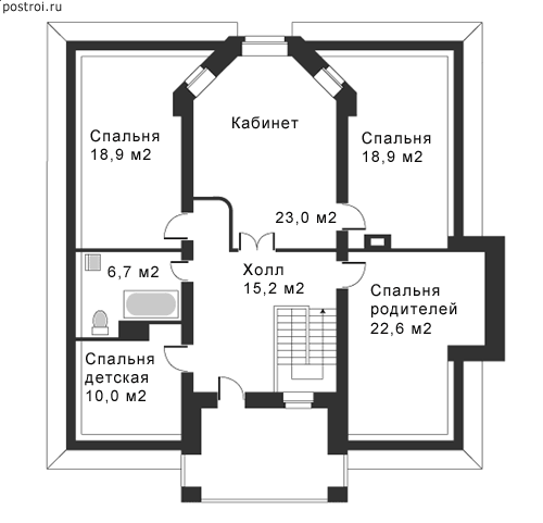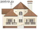 Проект набольшого коттеджа может быть рекомендован для застройщика среднего уровня достатка. Планировка дома, максимально приближеная к квадрату 12х12, является одним из наиболее удачных решений с точки зрения теплосбережения и возможности планировки помещений хороших пропорций. Проект разработан для строительства на грунтах с верховодкой и имеет ниже уровня первого этажа только техподполье, расположенное в цоколе. Планировка первого этажа отличается интересным решением пространства гостиной, объединенной с кухней и каминной. Кроме топочной и санузла первый этаж включает также две небольшие комнаты. Компактная схема мансардного этажа состоит из четырех спален с освещением через наклонные окна в кровле типа Velux, хорошо освещенного трехсторонним светом эркера большого кабинета и современно оборудованного санузла. Все помещения мансардного этажа раскрываются в светлый холл, из которого есть выход на лоджию, расположенную над крыльцом главного входа.