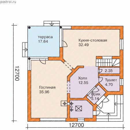 Типовой проект квадратного дома, представлен общей площадью 228,45 кв.м и габаритами 12,7 на 12,7 м. Общая планировка сооружения, позволяет комфортно проживать семье 3-4 человек. В виде фундамента в проекте используется монолитная ж/б плита, стены из кирпича с утеплителем и наружной отделкой облицовкой фасадными плитами по деревянному каркасу. Битумная черепица используется для покрытия мансардной кровли. Первый этаж, располагает прихожую, санузел с душевой кабиной, кладовую, котельную, кухню-столовую, гостиную с камином и возможным выходом на угловую террасу. На втором этаже, запроектировано три спальни, две ванные комнаты, кабинет для работы на дому и лоджия. Планировка мансарды, представлена вторым светом с акцентом на зону холла и одной комнатой, назначение, которой застройщик выбирает сам