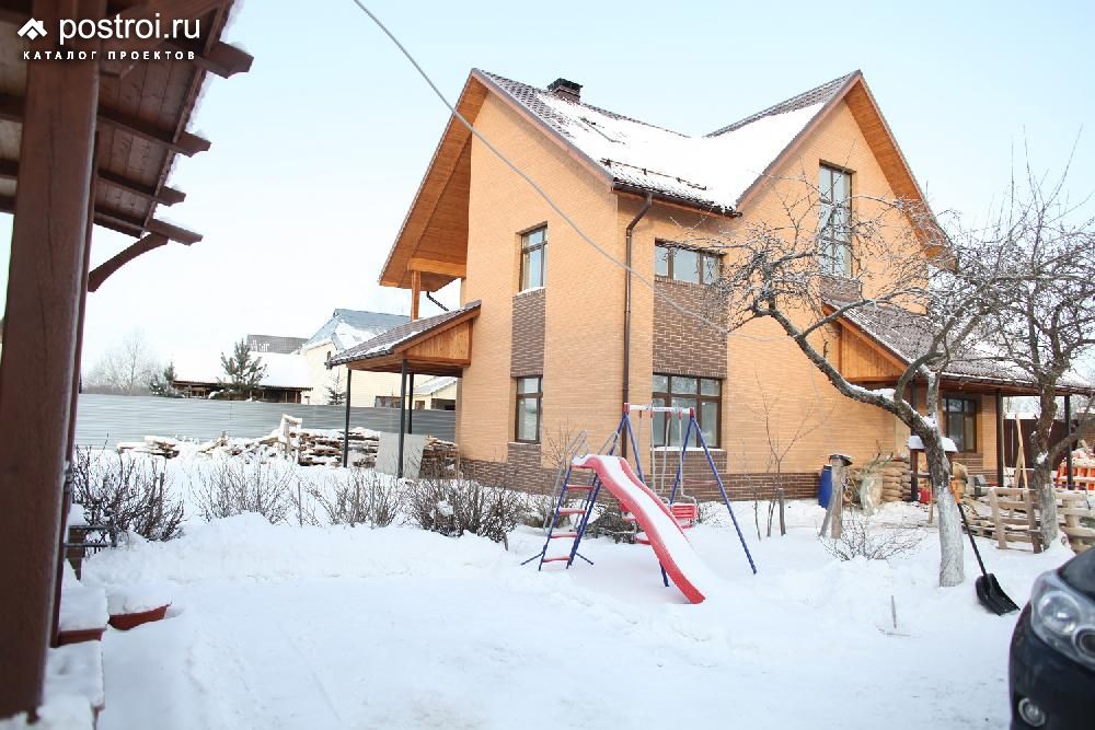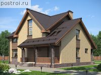Один из самых популярных проектов. Современный и комфортабельный дом подойдет для большой семьи. Здесь и небольшая уютная, тихая комната для пожилых родителей, и просторные спальни с гардеробными на втором этаже, а небольшой чердачок может стать любимым местом для игр младших членов семьи. Особенностью этого дома является терраса с барбекю. Архитектура этого дома интересна и понятна. Она послужила основой для проектирования целой серии таких домов. Пропорциональный и пластичный фасад, удачное сочетание отделочных материалов - кирпича, дерева и камня делают этот дом особенным и интересным. Над вторым этажом находится еще одна комната, площадью 26,1 м2.