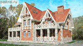 Проект русского дома по праву занимает одну из лидирующих позиций. Проект был создан еще в 2003 году и не утратил популярности благодаря удачному решению архитектора относительно фасадов и планировки. Острый угол крыши и множество декоративных элементов придают дому неповторимый колорит и шарм. Причем сочетание элементов отделки и цветовой гаммы может быть разным и это придаст Вашему проекту оригинальности. Огромным преимуществом является кабинет на первом этаже, который при желании можно оборудовать как жилую комнату. Котельная имеет отдельный выход на террасу. Необычное расположение лестницы позволяет значительно расширить жилое пространство дома. На втором этаже расположены три спальные комнаты и спортзал, из которого, через небольшую комнату отдыха, Вы попадаете на балкон. Наличие большого количества террас и балконов вообще придает дому из кирпича много комфорта. Также над вторым этажом располагается уютный чердак, в котором можно разместить по своему усмотрению любые жилые или хозяйственные помещения.
