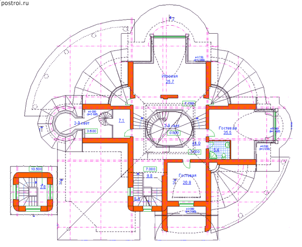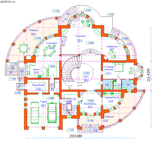 Проект огромного дома, общей площадью 1269,5 кв.м с габаритами 21,42 на 23,18 м, представлен в виде двух полноценных этажей, цокольного и мансардного. Имеет довольно необычную архитектуру, чем привлекает свой взгляд. Такой особняк, может разместить большую семью вместе с обслуживающим персоналом. Возводится проект на монолитной ж/б плите, наружные стены из кирпича с отделкой штукатуркой, кровельное покрытие представлено мягкой черепицей. Планировка дома, располагает на цокольном этаже зону отдыха в виде бильярдной, хамама с душевой и спа, тренажерного зала, также для персонала обустроена комната с личной ванной комнатой. Первый этаж, располагает гараж для двух машин, гостевую спальню, террасу, кухню-столовую, гостиную с эркером. На втором этаже, запроектирована большая библиотека, кабинет, родительская спальня, детская, большая ванная комната, гардеробная, несколько балконов. На мансардном этаже, предусмотрена игровая для детей и несколько гостевых спален