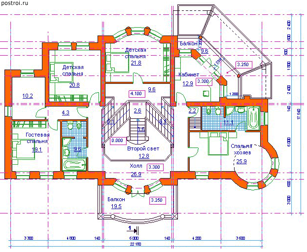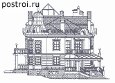 Десятикомнатный двухэтажный жилой дом со встроенным гаражом на два автомобиля предназначен для строительства в Подмосковье на участках с выраженным рельефом. В решении фасадов используются как классические элементы, так и детали, относящиеся к русскому барокко. Разработан проект бани см. S-157-1K.