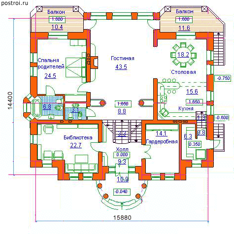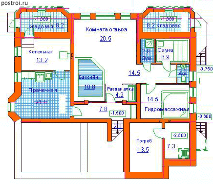 Проект коттеджа с бассейном для большой семьи с постоянным проживанием. Проектное решение кирпичного дома имеет осевую композицию дома с парадным входом и делением внутреннего пространства по подуровням внутренней лестницей. В переднюю часть дома (ко входу) вынесены библиотека и гардеробная, вся представительская зона первого этажа расположена на пол-уровня ниже. На втором этаже над гостиной размещен музыкальный салон, куда с двух сторон выходят детские комнаты. Всю переднюю часть второго этажа занимают апартаменты хозяев дома - спальня, холл-будуар, гардеробная, большая ванная. Для внешнего облика дома характерно присутствие элементов русского ампира, одного из наиболее устойчивых стилевых направлений в отечественном усадебном строительстве прошлого века.