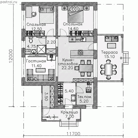 T-086-1P - проект современного одноэтажного дома из габетона размером 12 х 12 и общей площадью 86 м2. Вход в дом представлен крытым крыльцом. Слева небольшая кладовка. Далее прихожая и котельная слева. Две, спальни, маленькая гостиная и достаточно просторная столовая с выходом на террасу.