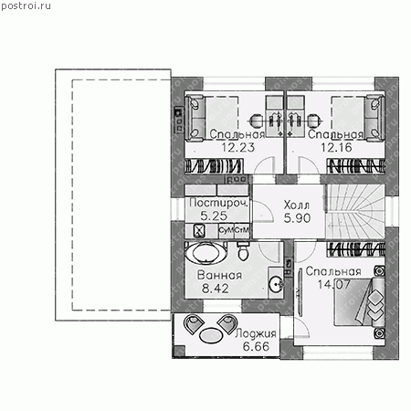 Проект небольшого дома из газоблоков или кирпича – для людей, у которых хотя бы раз возникала мысль: «Хочу построить дом с гаражом и сауной». Функциональная планировка будет радовать владельцев наличием всего необходимого для комфортного проживания в удаленности от города. Пристроенный гараж-навес, более экономичный в строительстве, рассчитан на размещение одного автомобиля. В стесненных условиях ограниченной площади земельного участка, когда возведение отдельного строения бани затруднительно и каждый квадратный метр на счету, сауна в доме – идеальное решение. Для парной/сауны и душевой выделены помещения, объединенные в санитарно-гигиенический блок, на первом этаже. Монтаж оборудования и разработку проекта сауны рекомендуется осуществлять на профессиональной основе силами специалистов компаний, специализирующихся на данном виде работ. Двухэтажный дом с гаражом и сауной в варианте – без гаража, с кабинетом.
