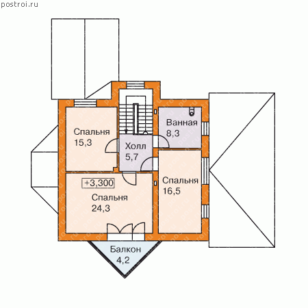 Коттедж 180 м с оригинальным треугольным эркером может быть выполнен из кирпича или газобетона. На первом этаже треугольный и многоугольный эркеры формируют многогранное единое пространство гостиной, столовой и кухни, на втором – позволяет оборудовать одну из спален оригинальным балконом. Две другие спальни и ванная комната сгруппированы вокруг холла с лестницей, находящейся в квадратном эркере заднего фасада. Справа от лестницы, на первом этаже расположены помещения хозяйственного назначения: техническое для размещения отопительного оборудования, санузел, прихожая, тамбур. Главный вход в дом осуществляется с крыльца, оборудованного кровлей. Второй вход в дом расположен с террасы заднего фасада – в кухню. С правого фасада к дому пристроен гараж–навес для одной машины.