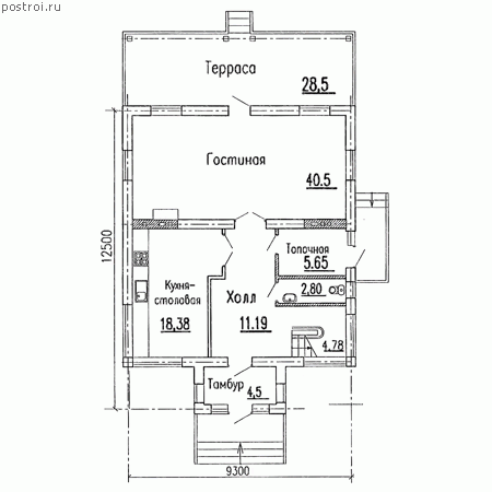 Проект дома с плоской кровлей, общей площадью 187,6 кв.м и габаритами 12,5 на 9,3 м, без учета террасы на заднем дворе. Коттедж выделяется большим угловым окном и балконом на переднем фасаде. Планировка дома, позволяет разместить семью из 3-4 человек. Наружные стены возводятся из ячеистых блоков, которые опираются на фундамент в виде монолитной ж/б плиты. На первом этаже находятся тамбур, кухня-столовая, санузел, топочная с выходом на улицу, просторная гостиная, из которой можно выйти на террасу и любоваться пейзажем. Второй этаж коттеджа с плоской кровлей, запроектирован с тремя спальнями, большой ванной комнатой и общим балконом. Данный проект, разработан в зеркальном варианте