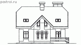 Спокойный внешний вид проекта красивого дома из кирпича гармонично впишется как в уже застроенную местность, так и в природный пейзаж. А нестандартная внутренняя планировка позволит сформировать прекрасный интерьер внутри дома. Основной интерес при рассмотрении планировки представляет лестница, запроектированная по спирали вокруг каминного дымохода. Таким неординарным решением разграничено единое пространство гостиной и кухни столовой. Так же в проекте предусмотрена топочная, имеющая как отдельный выход на улицу, так и вход в дом. Еще одним плюсом является кабинет на первом этаже. На втором этаже вокруг круглого входа расположены три спальные комнаты, одна из которых содержит отдельную ванную и имеет выход на балкон в переднем фасаде дома из кирпича, а так же общая ванная комната.