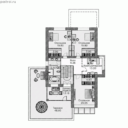 Для возведения современного комфортабельного коттеджа – проект дома с гаражом на 2 машины. Со стороны главного фасада располагается гараж. Венчает его открытая площадка – угловая терраса, куда организован доступ с остекленной лоджии второго этажа. Здесь расположены три уютные спальни. Еще одну жилую комнату можно получить при необходимости отделив часть площади холла. Основные помещения нижнего уровня дома – гостиная с эркером и камином, кухня, столовая, где находится междуэтажная лестница, являющаяся значимым элементом интерьерного пространства. Для полноценного отдыха запроектирована сауна с душевой. Проектом дома с гаражом на 2 автомобиля предложена альтернатива материала строительства наружных стен: газо(пено)бетон или пустотный кирпич.