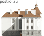 Трехэтажный загородный дом, построенный по этому проекту в Ленинградской области, имеет респектабельный вид, отвечает высоким требованиям комфортного проживания и демонстрирует реальное воплощение мечты его владельца. В цокольном этаже расположены гараж на две машины, бассейн, банный комплекс, предусмотрено помещение для охраны. Первый этаж содержит просторную гостиную, кухню, гостевые комнаты, кабинет хозяина дома. На втором этаже расположены детская и спальни. Архитектурное решение винтовой лестницы, расположенной в круглой башне, придает фасадам особняка выразительный вид. Территория, на которой расположено подобное фундаментное строение, должна быть строго и логично распланирована. Английские газоны, дорожки из натурального камня, скульптуры из мрамора добавят очарования и подчеркнут классический характер постройки.