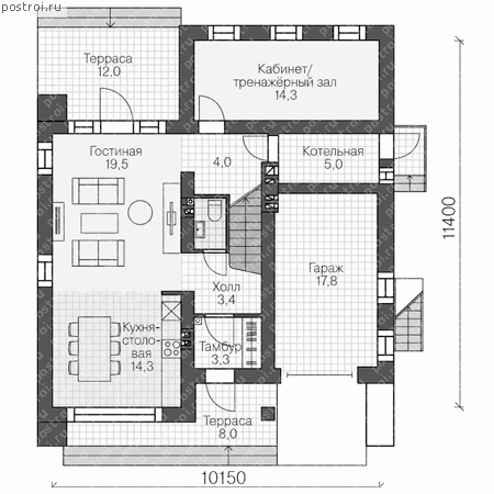 Современный дом с плоской кровлей, предназначен для круглогодичного проживания семьи из 3 человек. Общая площадь проекта из газобетона – 128 кв.м с габаритами 11,4 на 10,15 м. Современный дом выполнен в стиле модерн с большими панорамными окнами. На фасадах выделяется второй этаж с открытой угловой террасой, на которой можно устраивать вечеринки. Предусмотренный гараж , рассчитан для одного автомобиля. Первый этаж, располагает котельную с выходом на улицу, санузел, помещение кухни-столовой представлено одним целым с гостиной, из которой обустроен выход на террасу. Также запроектировано помещение, назначение которому застройщик выбирает сам, то ли обустройство кабинета, то ли тренажерного зала. Зона отдыха и сна хозяев, представлена на втором этаже: две спальни и ванная комната, совмещенная с санузлом. В современном доме, предусмотрена лестница, ведущая на террасу второго этажа
