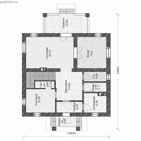 Дом с удобной планировкой запроектирован из газобетонных блоков с наружным утеплением. Внешний облик дома, тяготеющий к классическому, формируют: шатровая кровля, в основании которой лежит квадрат ˗ строгие четкие линии фасадов, крыльцо с колоннами, отделанными камнем грубой фактуры, поддерживающими балкон, симметрия витражных окон разнообразной формы. Шатровая крыша позволяет сэкономить материал стен из-за отсутствия фронтонов. Кровля отделана металлочерепицей, в отделке фасадов использована штукатурка, камень, деревянные декоративные элементы. Цоколь облицован камнем. Планировка дома предельно проста и максимально удобна. Нет лишних помещений и коридоров. В доме четыре спальни, одна из которых находится на первом этаже. Гостиная изолирована от кухни и имеет выход на крытую террасу. Площадь тамбура позволяет разместить в нем шкафы для верхней одежды и обуви. Из тамбура можно попасть в котельную, минуя жилые помещения дома. Дом предназначен для постоянного проживания 3-5 человек.